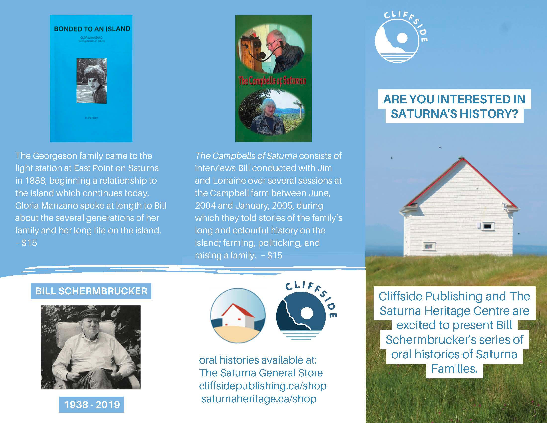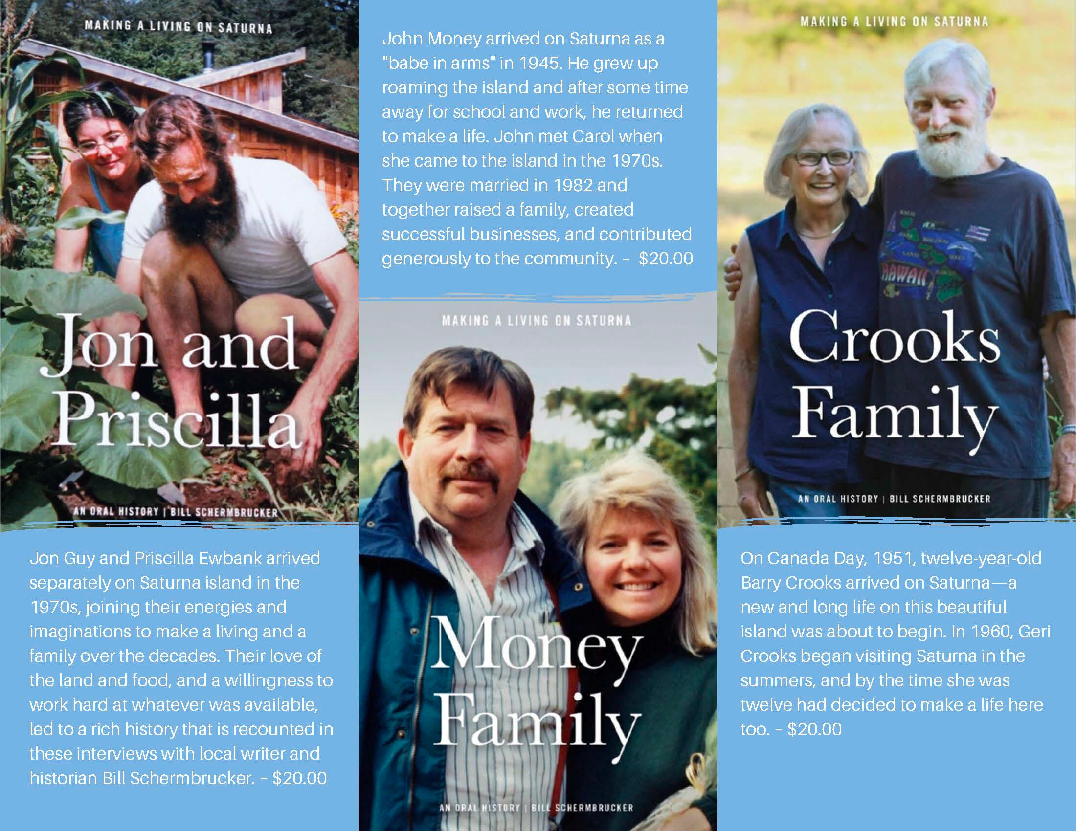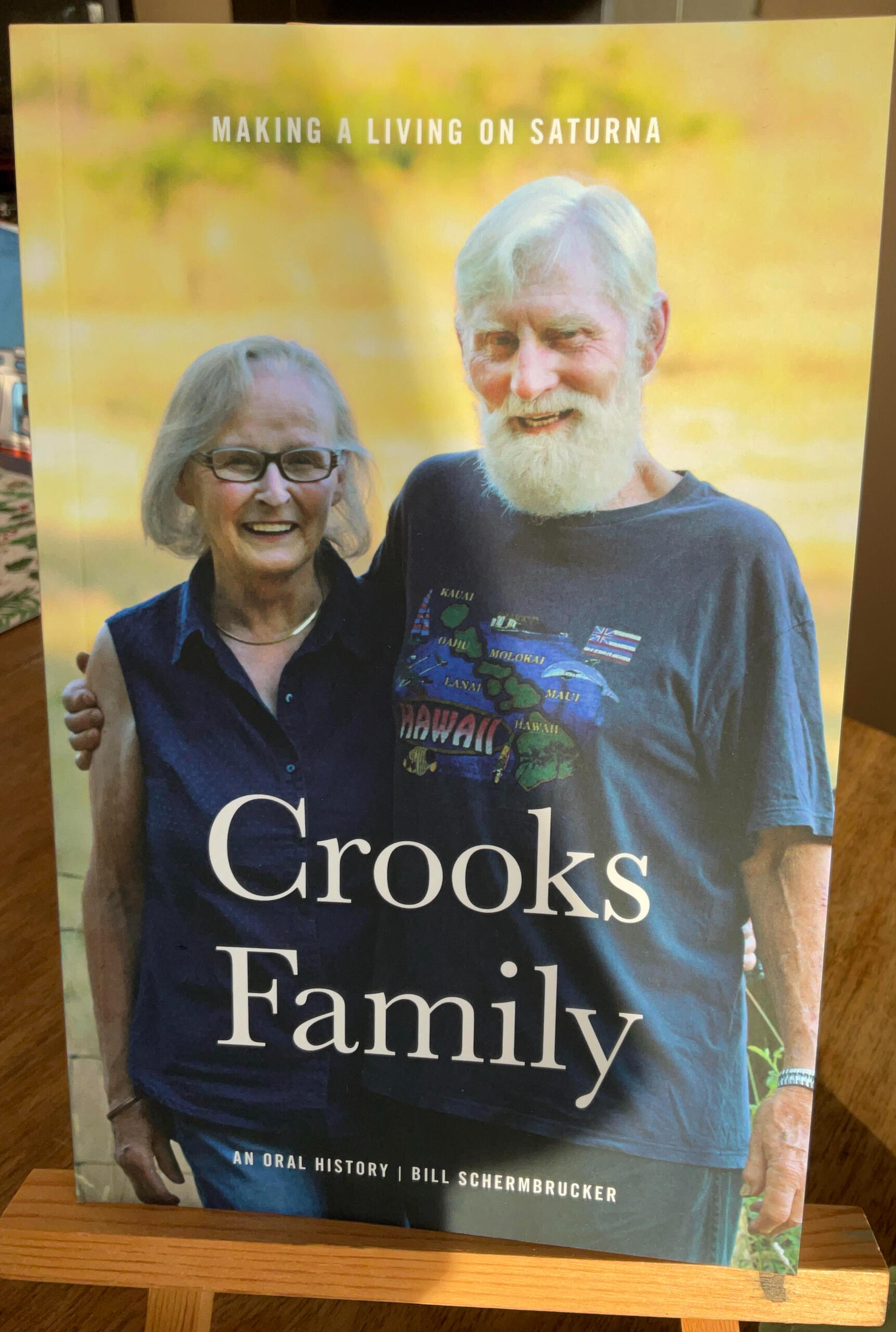 Books are available at Saturna General Store, Cliffsidepublishing.ca, and at the FAB building.Making a Living on Saturna: Crooks Family. Bill Schermbrucker and David Osbourne, graphic design Mark Timmings Publisher David Osbourne - Cliffside Publishing, Saturna Island 2022.